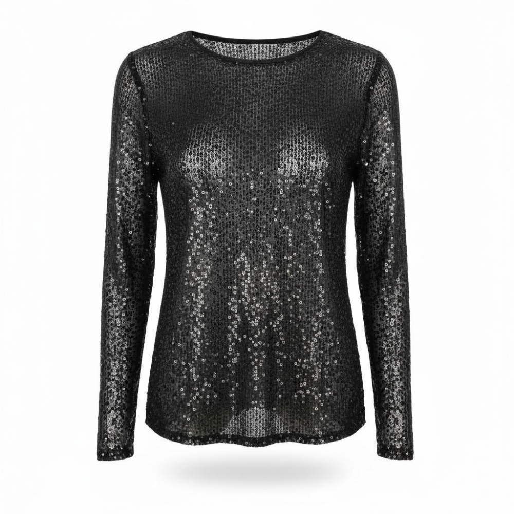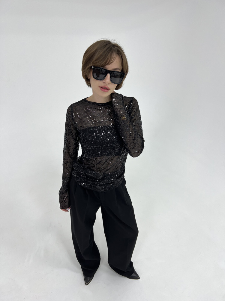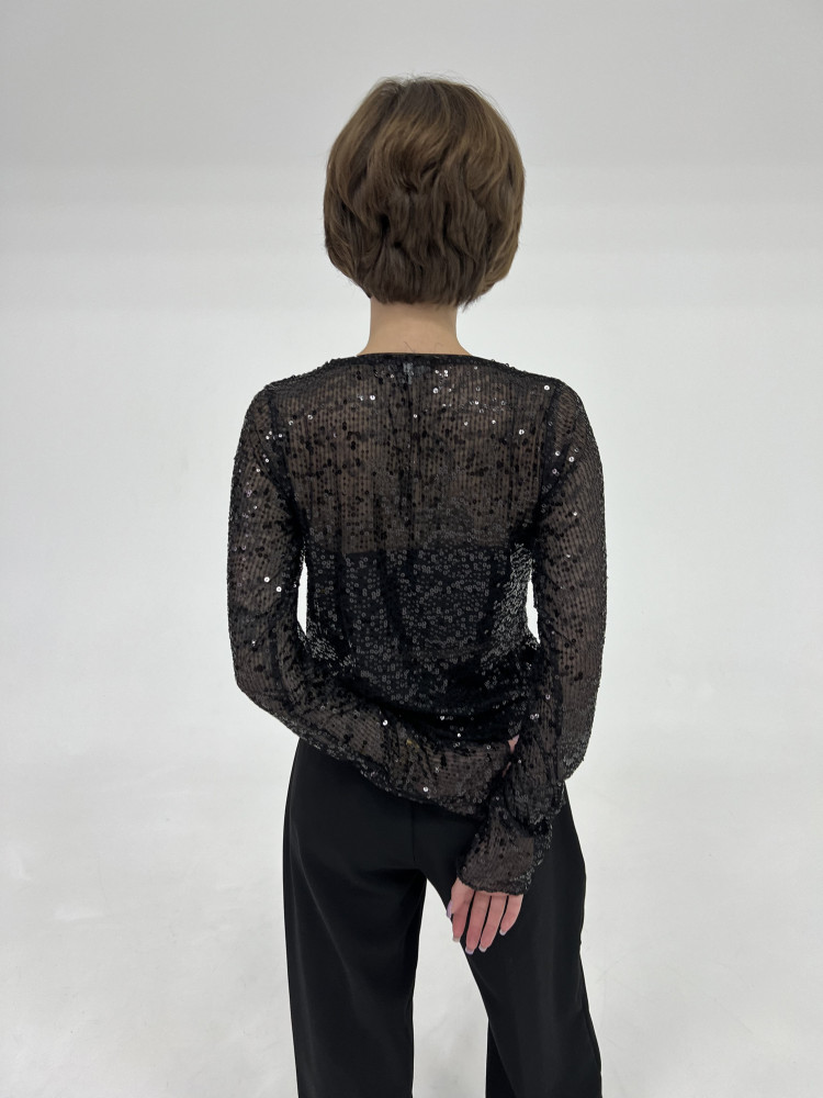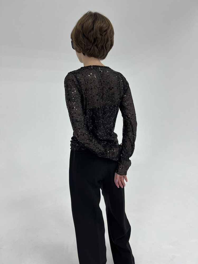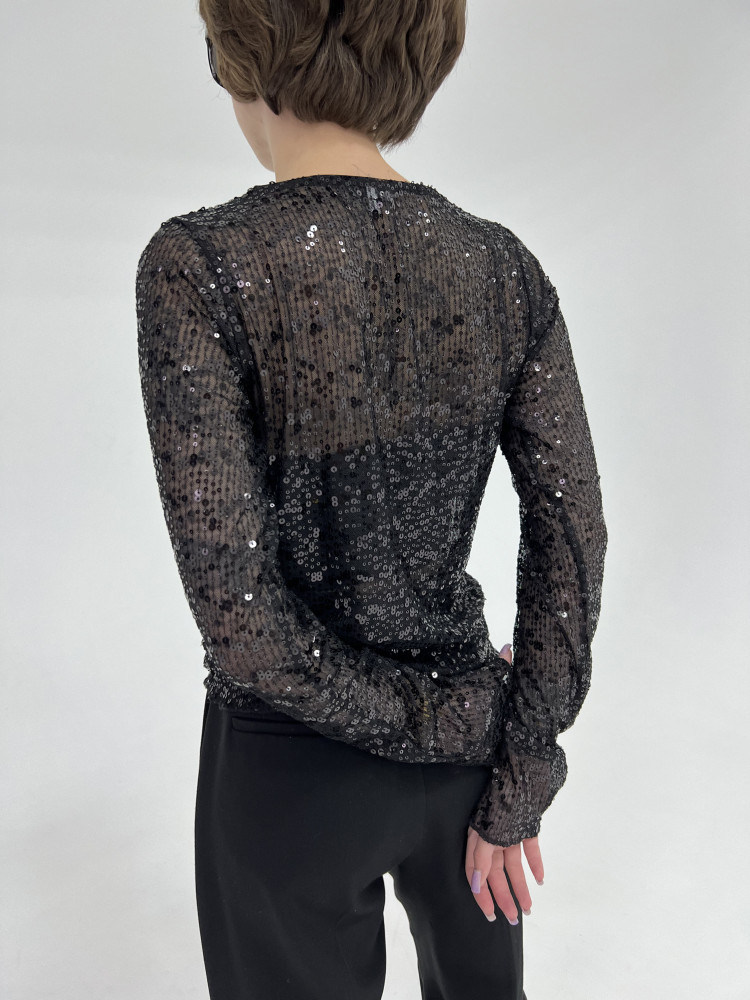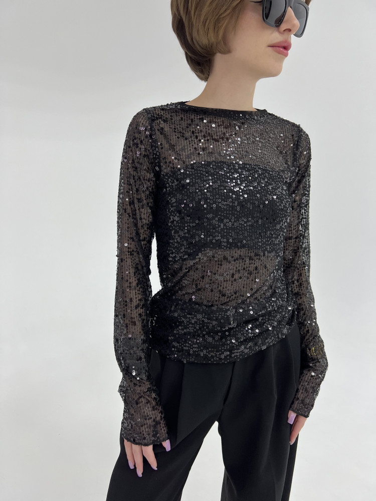 Полупрозрачный лонгслив с черными пайетками, мягкий, эластичный, комфортный к телу